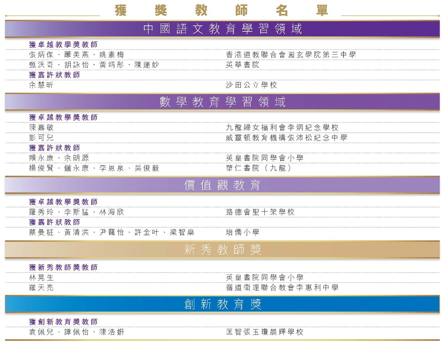行政長官卓越教學獎(2024/2025)頒獎典禮已於2025年7月4日圓滿結束。評審結果已經公布。239份收到的提名當中,5份提名(共12位教師)獲頒卓越教學獎,4份提名(共12位教師)則獲頒嘉許狀。另外,2份提名(共2位教師)獲頒新秀教師獎,1份提名(共3位教師)獲頒創新教育獎。