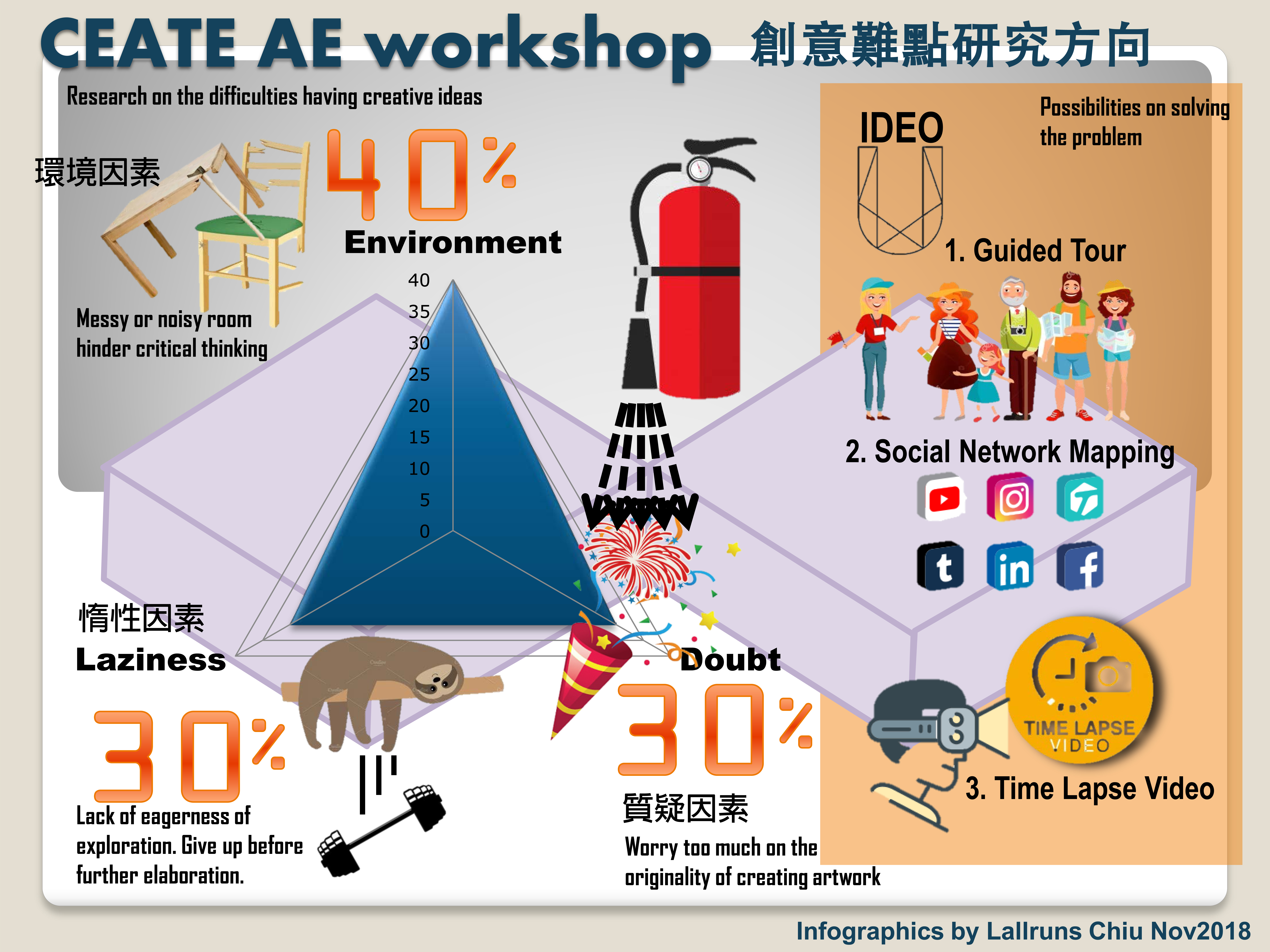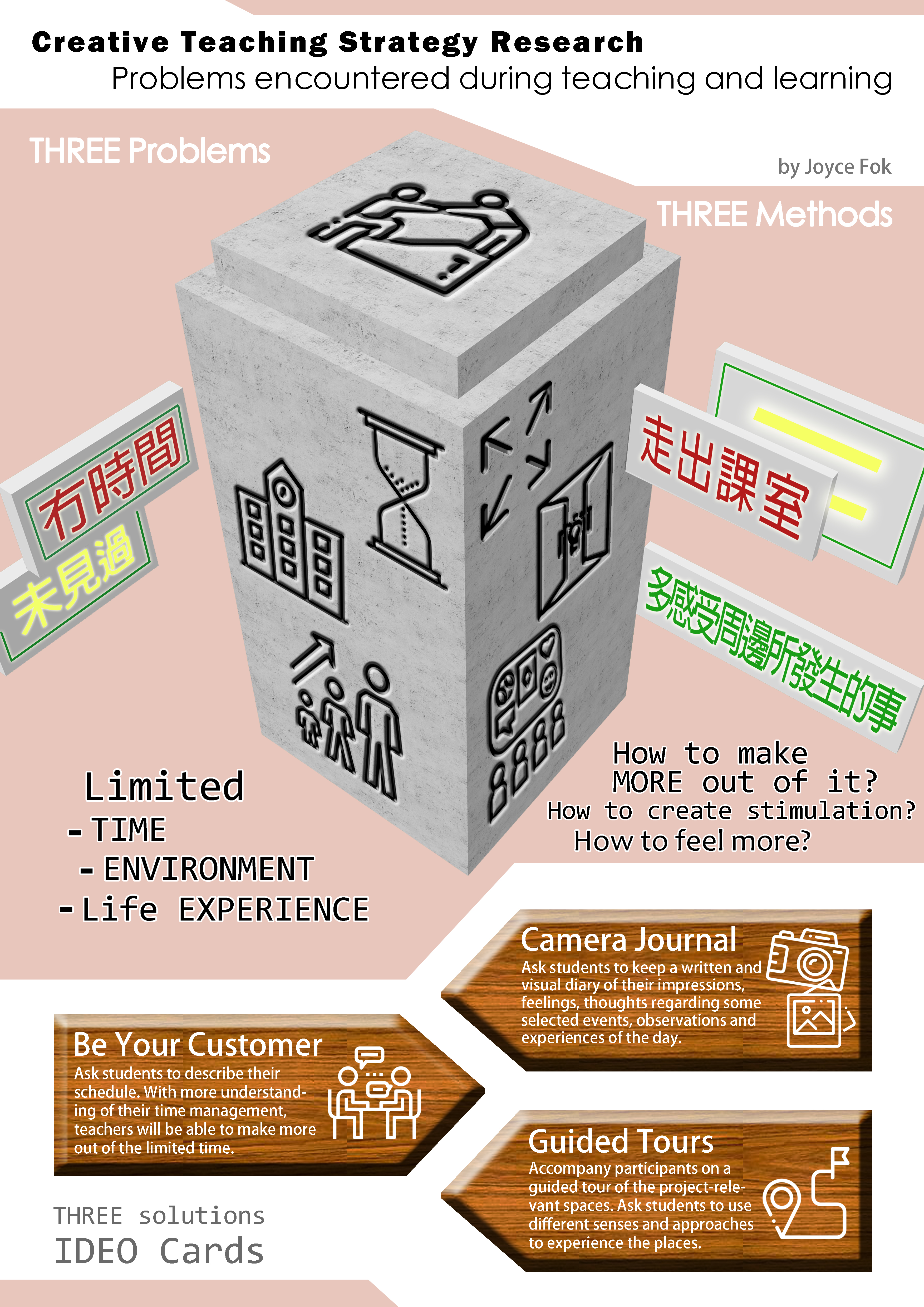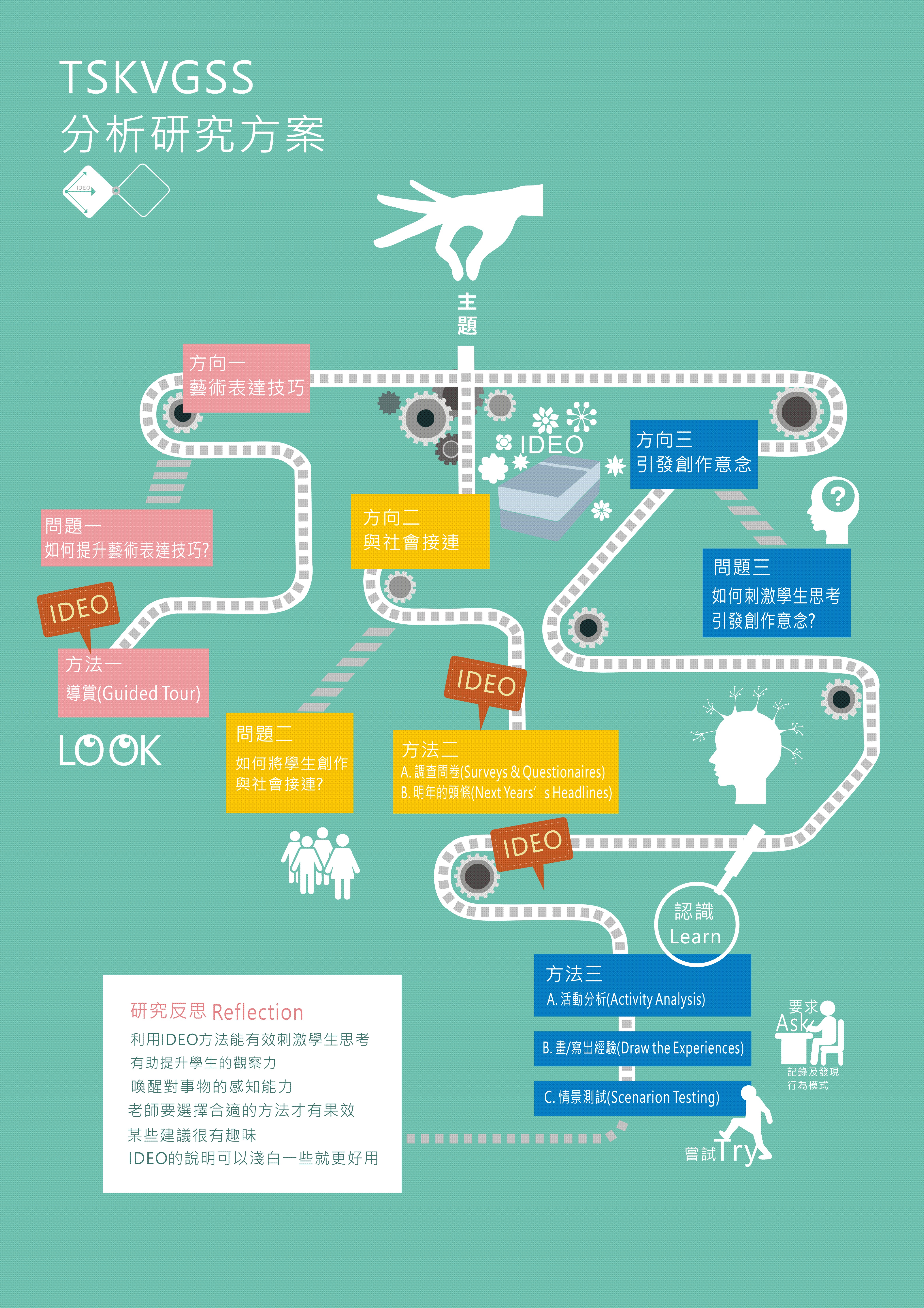 視覺藝術科的教師以圖像化的資訊圖表,展示其校本創意教學的研究方案,包括研究主題丶研究方向丶教學難點丶解決方法及教學反思,作為發展校本創意教學的藍本。